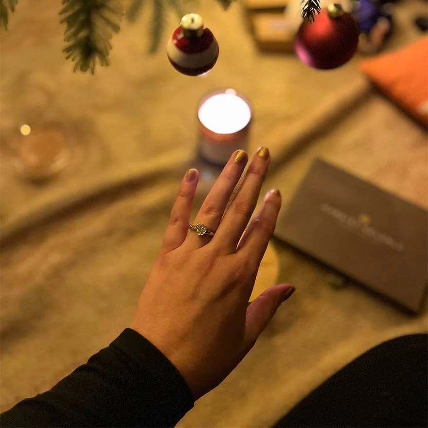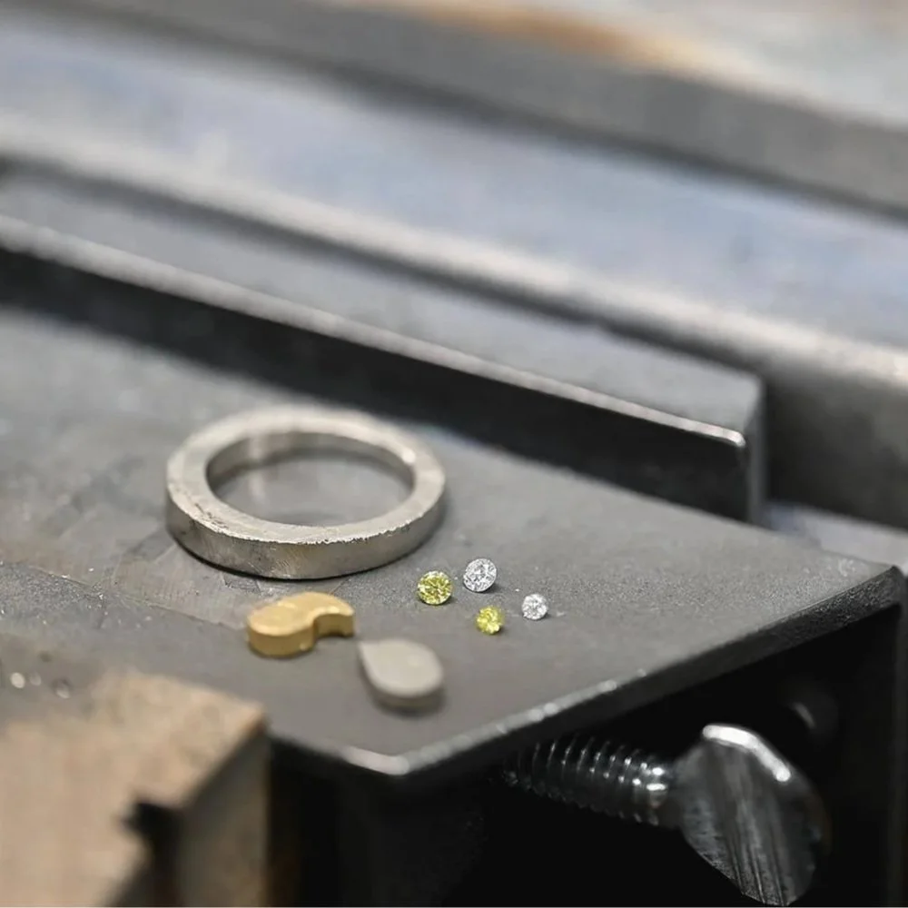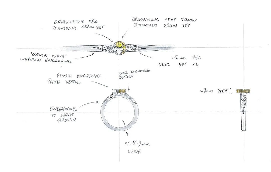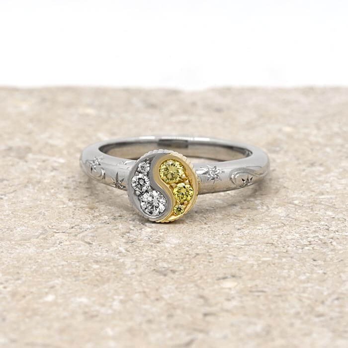 Lotte's celestial inspired engagement ring is a plate style with distinct curved sections, which represent the sun and moon. One side is a warm 18ct yellow gold with HPHT yellow diamonds, contrasting against the bright platinum and white diamonds. Star and swirl engravings continue along the band with white diamonds adding scatters of sparkle, bringing the cosmic theme together beautifully.